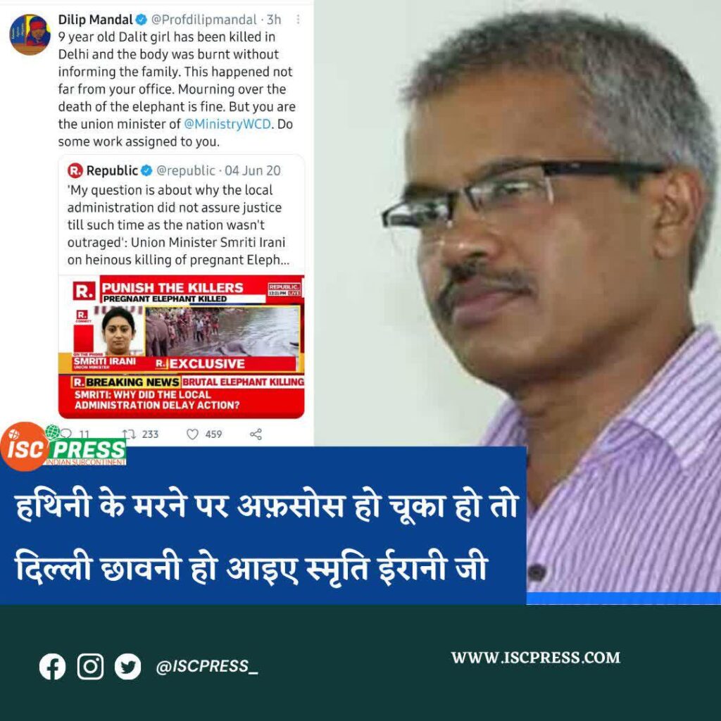 दिलीप मंडल ने अपने इस ट्वीट के साथ उस खबर को भी शेयर किया है। जिसमें केंद्रीय मंत्री स्मृति ईरानी द्वारा केरल में गर्भवती हथिनी की मौत पर दुख जाहिर किया गया था।