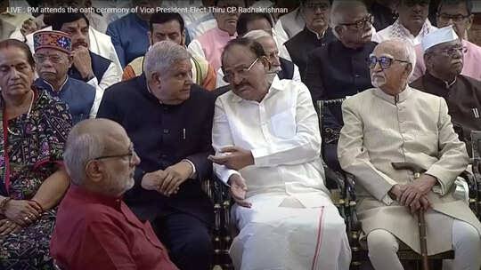 सीपी राधाकृष्णन देश के 15वें उपराष्ट्रपति बन चुके हैं। राष्ट्रपति द्रौपदी मुर्मू ने राधाकृष्णन को उपराष्ट्रपति पद की शपथ दिलाई। इस दौरान कार्यक्रम में पूर्व उपराष्ट्रपति जगदीप धनखड़ भी नजर आए। पद से इस्तीफा देने के बाद यह पहला मौका था जब धनखड़ किसी सार्वजनिक कार्यक्रम में शामिल हुए।