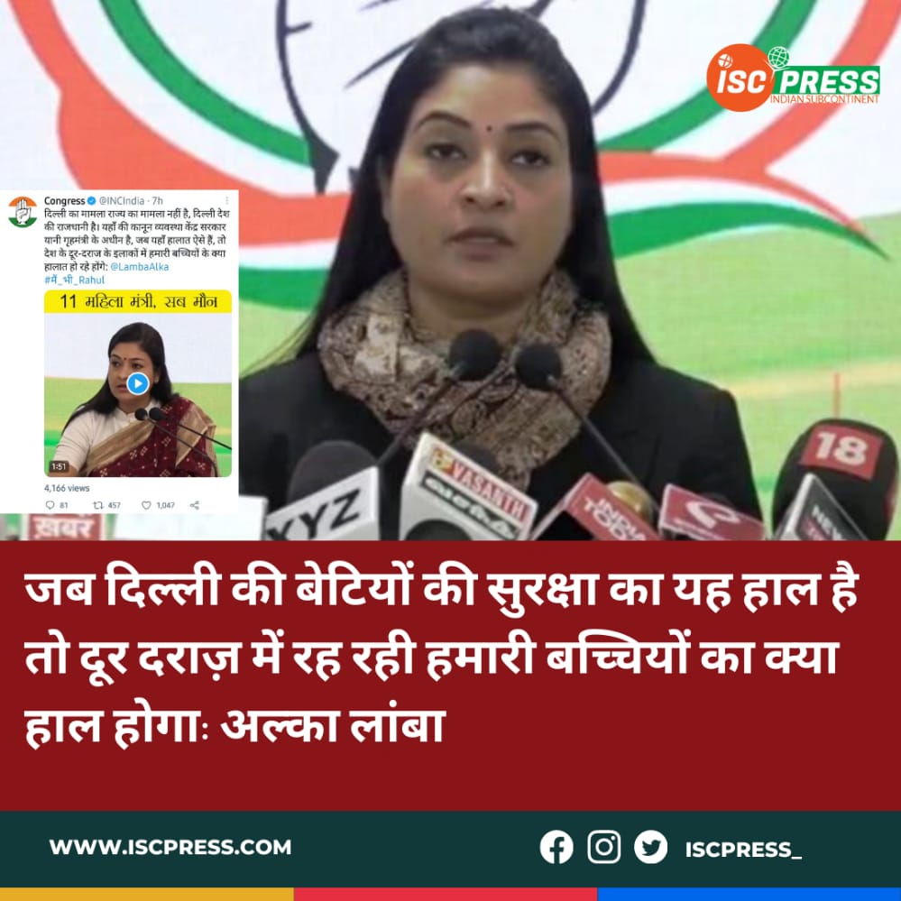 आज फिर अल्का लांबा की वीडियो को कांग्रेस पार्टी के आधिकारिक अकाउंट ने दिल्ली और उस तरह की घटनाओं से संबंधित एक ट्वीट कर कहा कि दिल्ली का मामला राज्य का मामला नहीं है, दिल्ली देश की राजधानी है, यहां क़ानून व्यवस्था केंद्र सरकार यानी गृह मंत्री के अधीन है, जब यहां हालात ऐसे हैं तो देश के दूर दराज़ के इलाक़ों में हमारी बच्चियों के क्या हालात हो रहे होंगे।