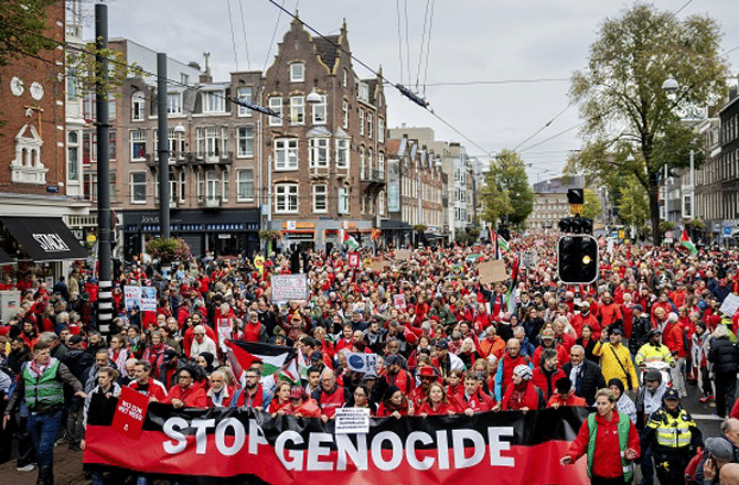 हॉलैंड की राजधानी एम्स्टर्डम में रविवार को करीब ढाई लाख लोगों ने “रेड लाइन मार्च” में हिस्सा लिया, जिसे देश के इतिहास के सबसे बड़े प्रदर्शनों में से एक बताया जा रहा है। लाल कपड़ों में शामिल प्रदर्शनकारियों ने म्यूज़ियम प्लेन से मार्च शुरू किया और सरकार से माँग की कि, वह ग़ाज़ा में जारी नरसंहार के ख़िलाफ़ साफ़ और सख़्त रुख अपनाए।