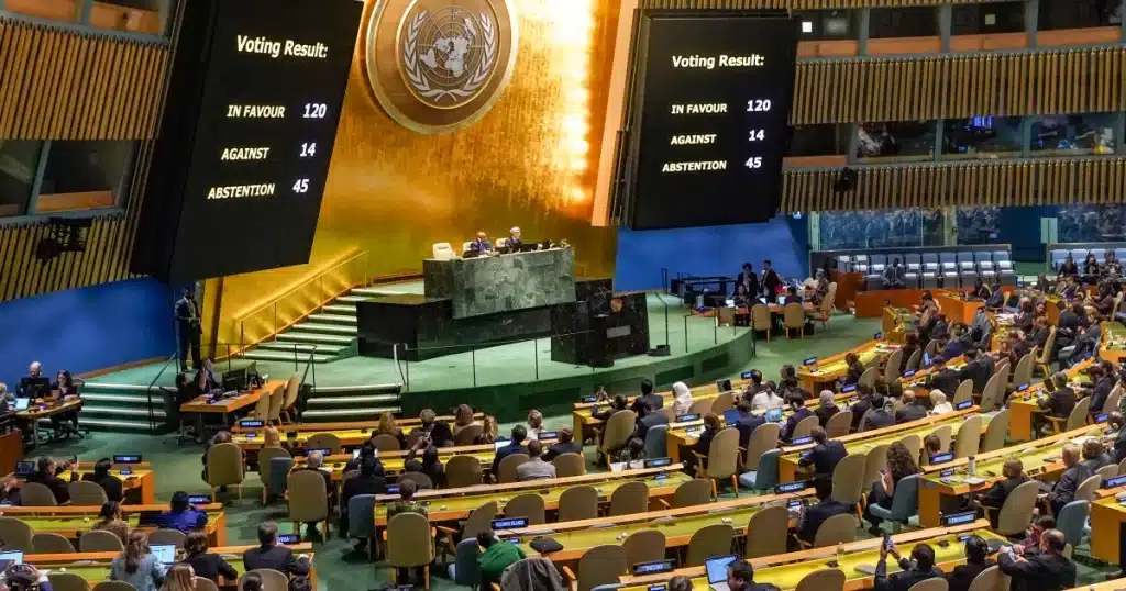 संयुक्त राष्ट्र महासभा की बैठक में फ़िलिस्तीन की अंतरराष्ट्रीय हैसियत को लेकर एक बड़ी और ऐतिहासिक प्रगति हुई है। महासभा ने अपने 80वें सत्र के दौरान एक प्रस्ताव भारी बहुमत से पारित किया। प्रस्ताव के पक्ष में 145 देशों ने वोट दिया, जबकि विरोध में केवल 5 वोट पड़े और 6 देशों ने मतदान में हिस्सा नहीं लिया। यह परिणाम इस बात का प्रमाण है कि वैश्विक समुदाय की बहुसंख्या फ़िलिस्तीनी जनता के आत्मनिर्णय के अधिकार और उनकी राजनीतिक संघर्ष को मान्यता देती है।