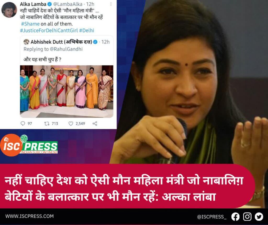 नहीं चाहिए देश को ऐसी मौन महिला मंत्री जो नाबालिग़ बेटियों के बलात्कार पर भी मौन रहें: अल्का लांबा